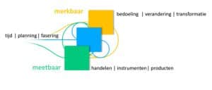 Dit zijn de concrete acties, instrumenten en producten. Bijvoorbeeld: het maken van een regiobeeld, het opstellen van een plan, het organiseren van een bijeenkomst of het ontwikkelen van een dashboard. Belangrijk is dat deze acties altijd verbonden blijven met de bedoeling. - Blauw – De Planning: