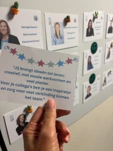 Anne-Marie en Esmee illustreerden hun verhaal met verschillende voorbeelden, bijvoorbeeld over hoe je het met collega’s onderling luchtig houdt en verbinding creëert. Samen lachen versterkt die verbinding en verlaagt stress. Toch schiet plezier er in drukke dagen vaak bij in. “Zorg af en toe voor luchtige momenten en geef complimenten: een klein moment van aandacht kan een grote glimlach brengen. Bij Mura had één van onze collega’s vorige maand als verrassing een wand gemaakt met kaartjes van al onze collega’s met drie kernwoorden die hem of haar beschreef met op de achterzijde een compliment. Niet toevallig tijdens de Week van het Werkgeluk. Dat zijn hele mooie dingen waarop je op een makkelijke manier een glimlach bij elkaar kunt bezorgen. Het zorgt voor werkgeluk én maakt samenwerken lichter, zelfs wanneer het druk is.”