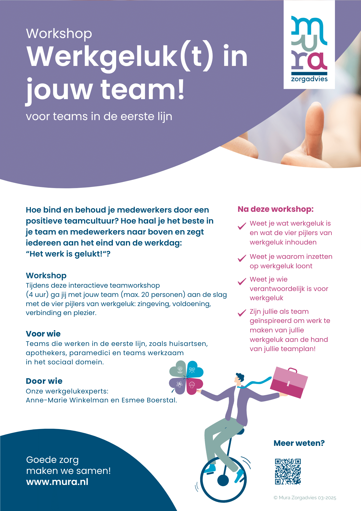 Wil je verder aan de slag met werkgeluk in jouw team? Mura biedt inspiratiesessies, trainingen en praktische tools om samen te bouwen aan een gezonde en gelukkige werkdag. Kijk op lekker blijven werken in de zorg of neem contact op met Esmee Boerstal of Anne-Marie Winkelman.